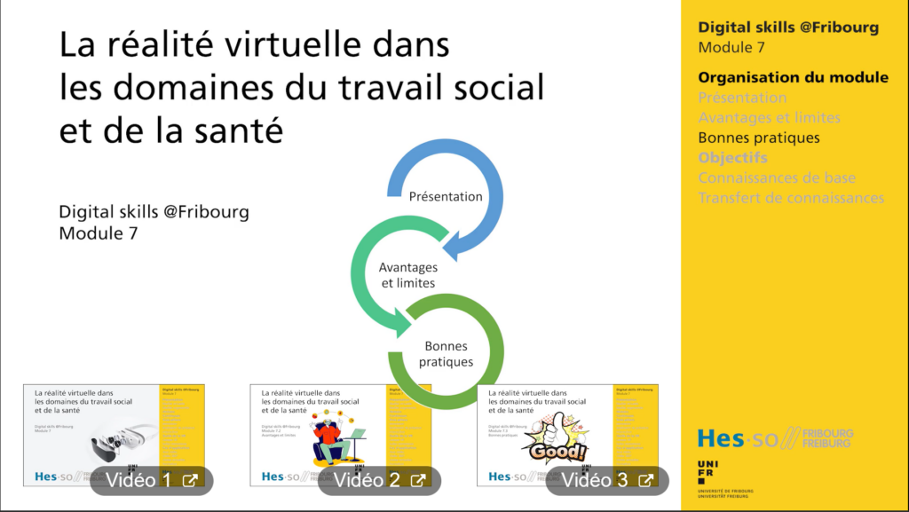 Une première série de capsule vidéos sur l’utilisation de la réalité virtuelle dans les domaines du travail social et de la santé est déjà disponible. Une autre série sur l’intégration de jeux sérieux dans sa pratique professionnelle est en cours de réalisation.